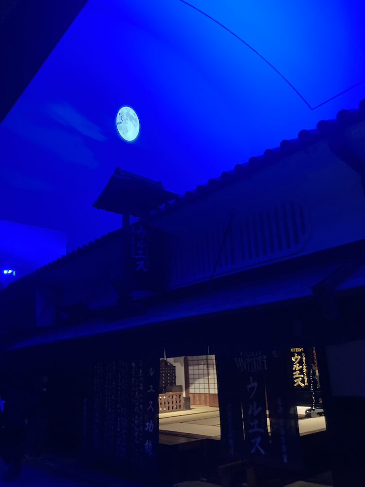 Grâce à des effets sonores et lumineux sophistiqués, le ciel du village évolue progressivement, passant de l’aube au crépuscule puis à la nuit. Ce cycle d’environ 30 minutes recrée l’atmosphère d’une journée complète. Entre soleil et orage, nous voilà transportées dans l’Osaka du XIXe siècle.